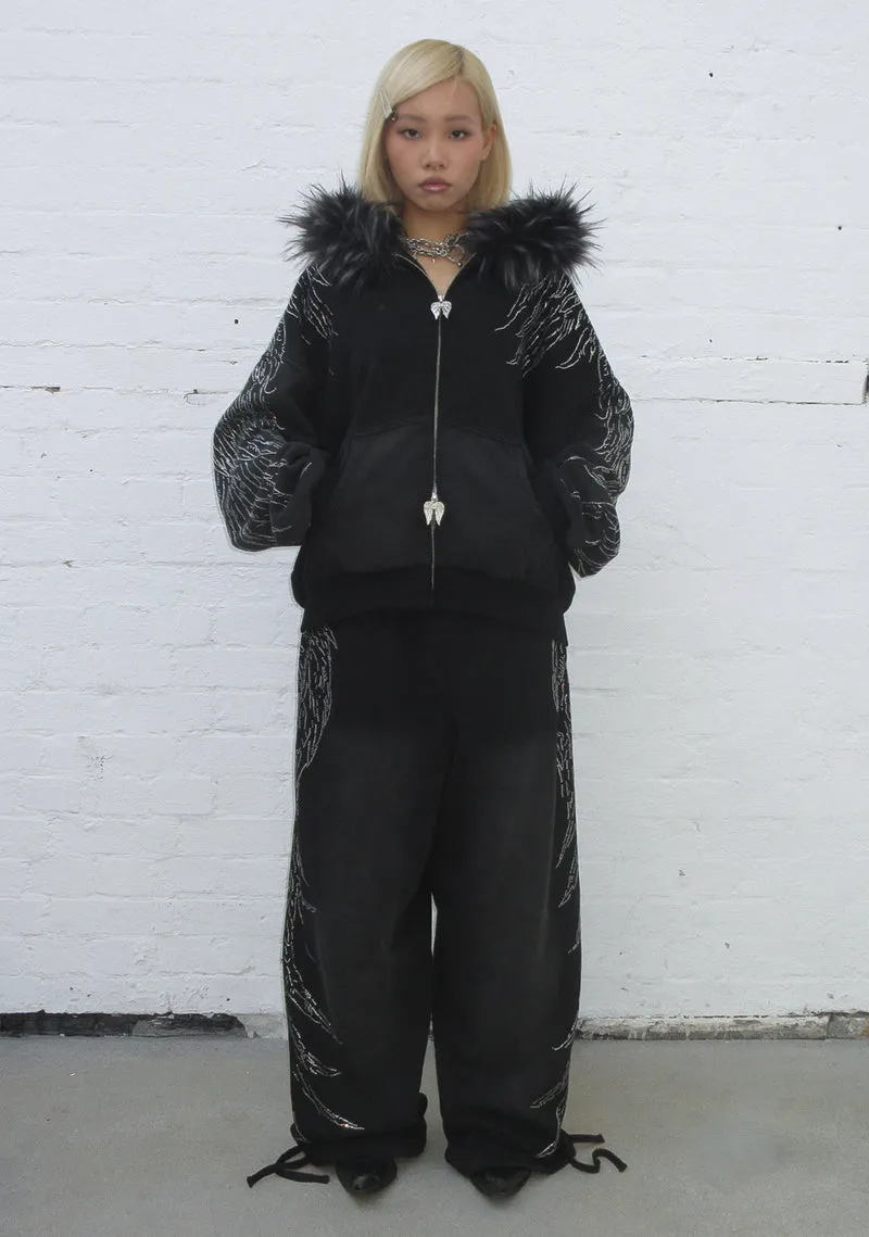 Fallen Faux Fur Rhinestone Zip Hoodie Washed Black (Detachable Fur)