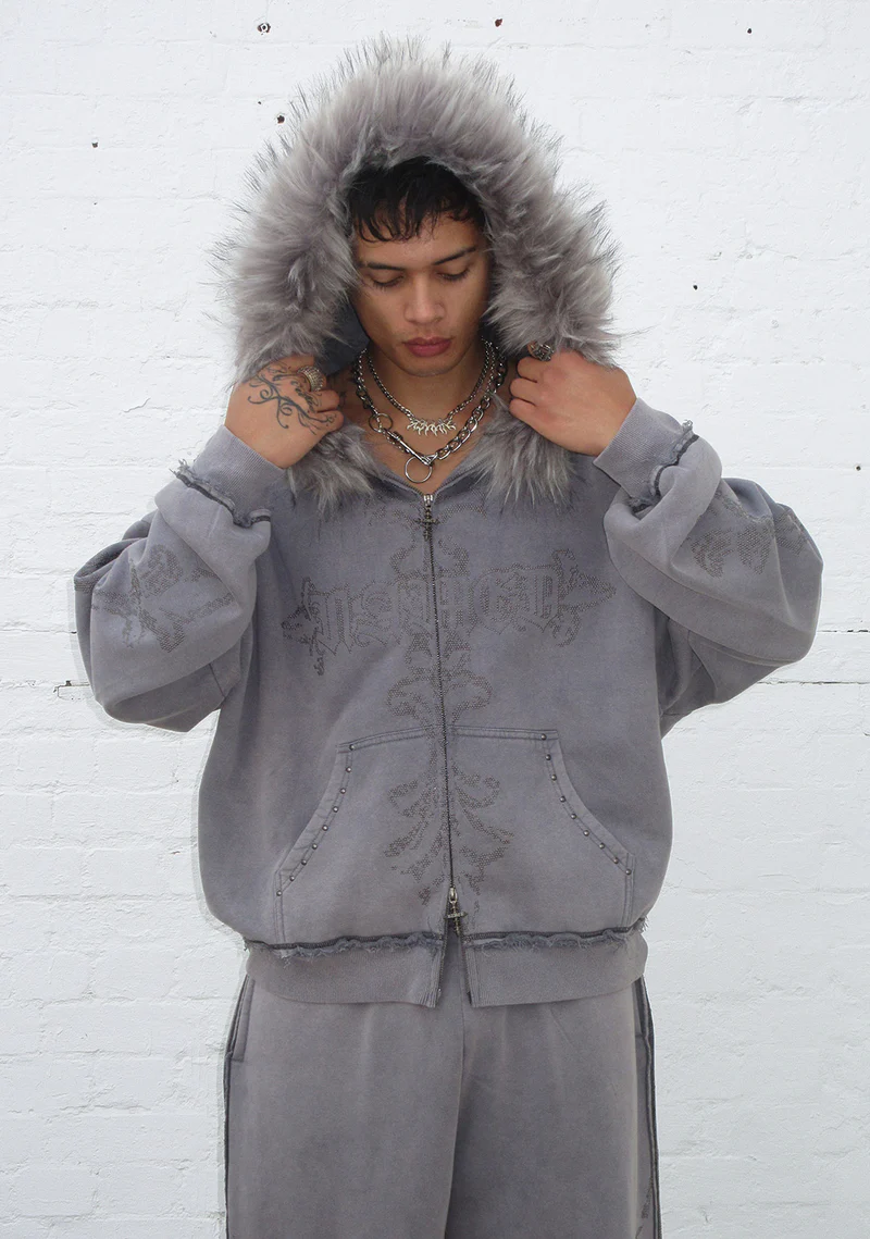 Feral Faux Fur Studded ZIP Hoodie Washed Grey (Detachable Fur)